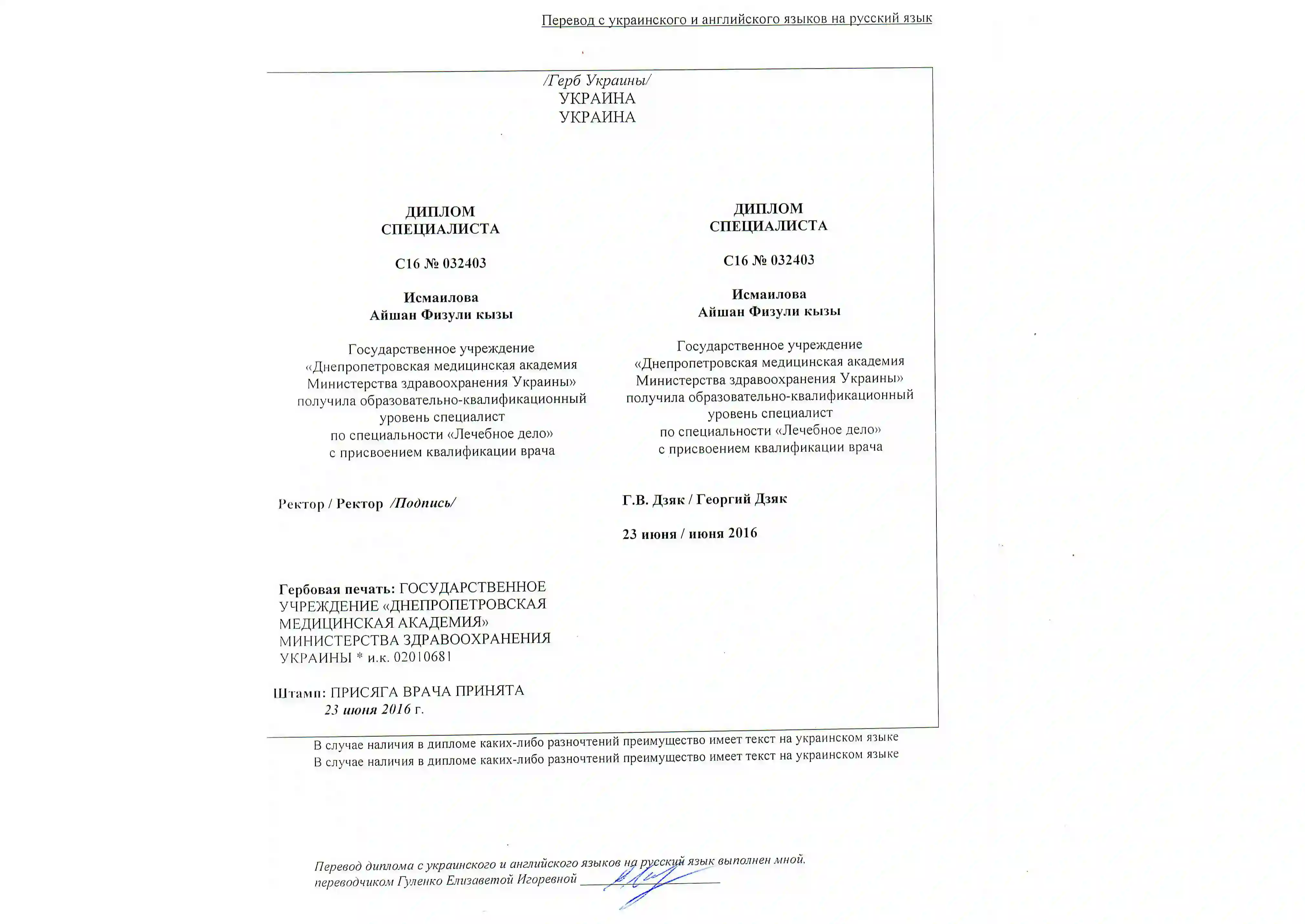 • 2016 — Днепропетровская медицинская академия (Украина). Врач по специальности «Лечебное дело».