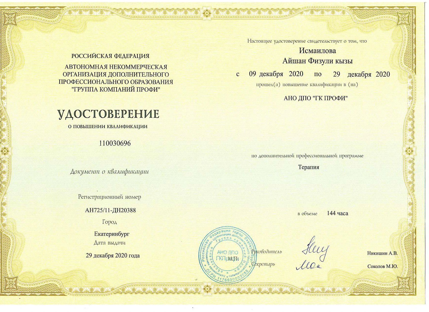 • 2020 — АНО ДПО «Группа компаний ПРОФИ». Повышение квалификации и получение сертификата специалиста по терапии/